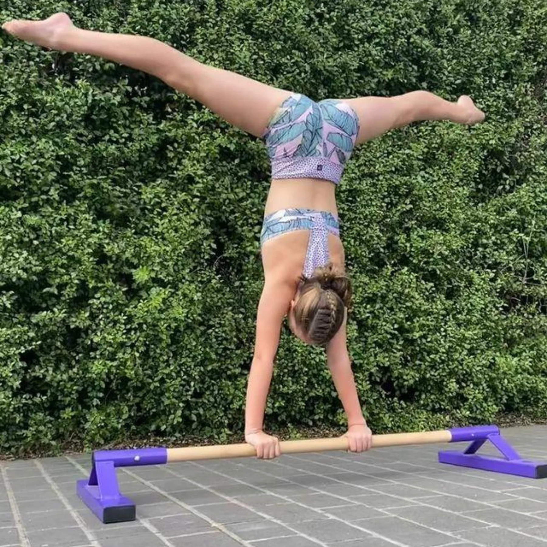 Our floor bar is used for both club and home use and helps develop strength and control during inversions. Being in control of a handstand is a skill practised by beginners through to advanced gymnasts! Solid hardwood rail, with a weight limit of 150kg. Available in Pink, Blue and Purple. Save and buy our floor bar pair for a discounted price!